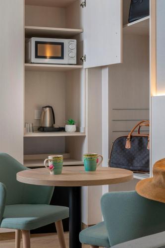 The apartments at Costa Encantada feature a lounge area with flat-screen TV and sofa bed. The kitchenette includes a fridge.
